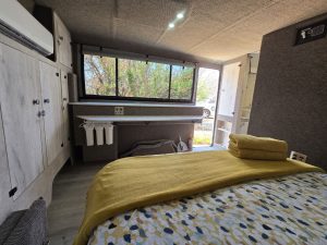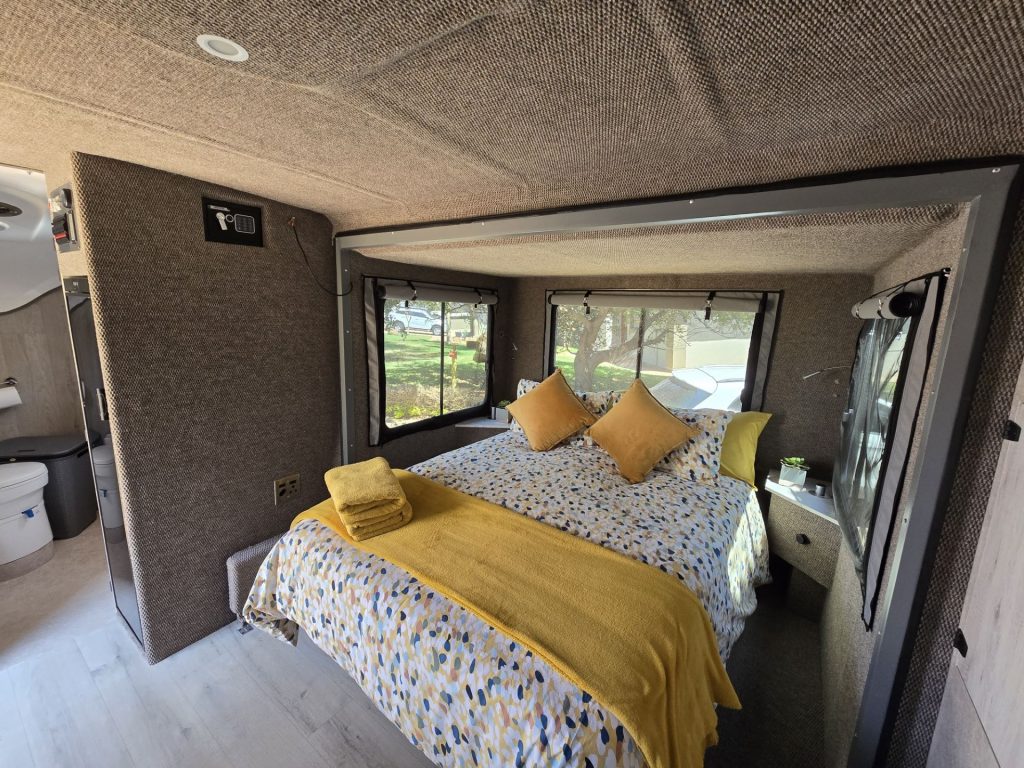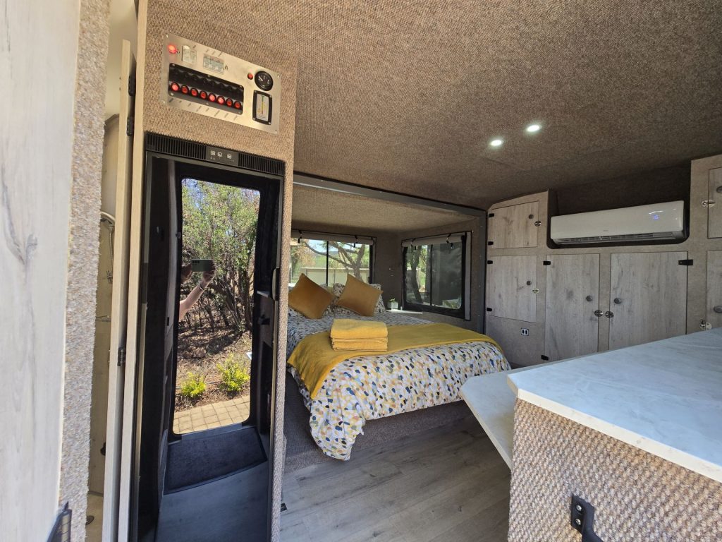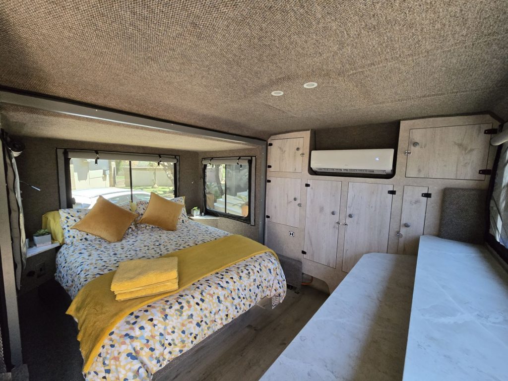 Running gear comprises three 16” mag wheels paired with 265/70/16 all-terrain tires. The slide room includes a permanent island bed, deluxe double mattress, three armored glass sliding windows, and three fly & privacy nets.