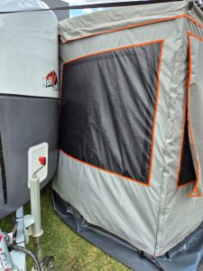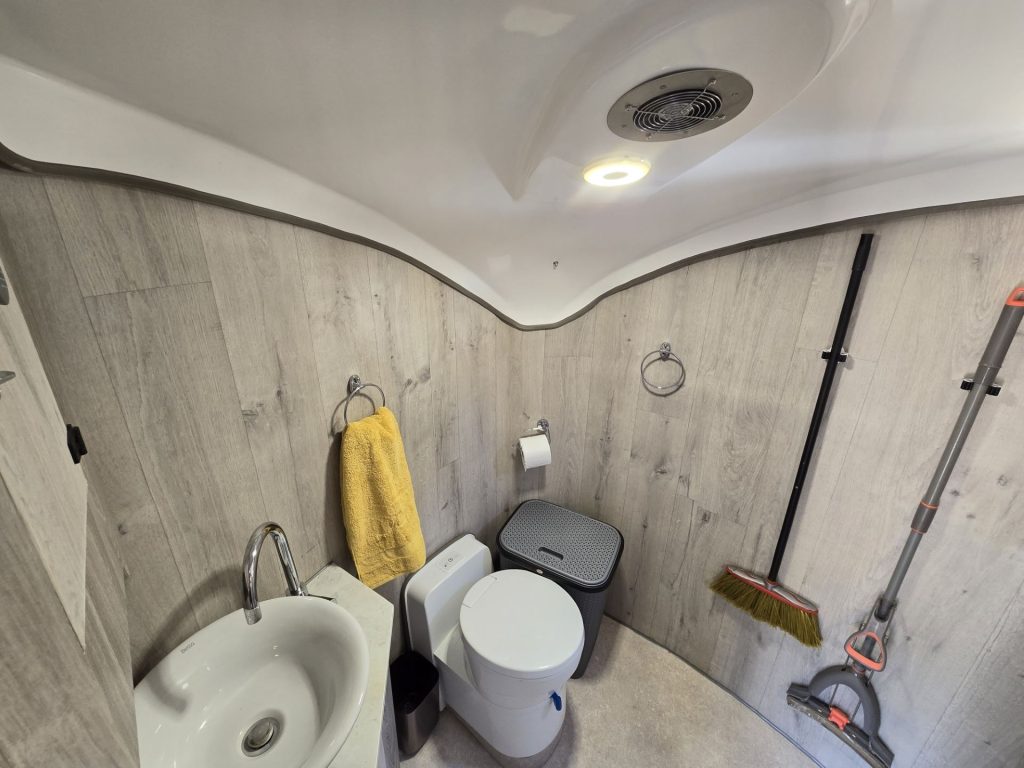 Inside, the bathroom features a fixed shower with a high-pressure pump, a direct-flow gas geyser for instant hot water, a 150L main water tank, and a Porta Potti chemical toilet. The dining area includes a table with stools, an 18L microwave, and a mini-bar with wine glasses and bottle holders.
