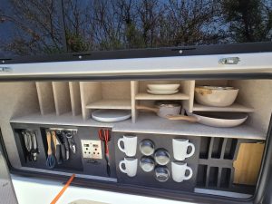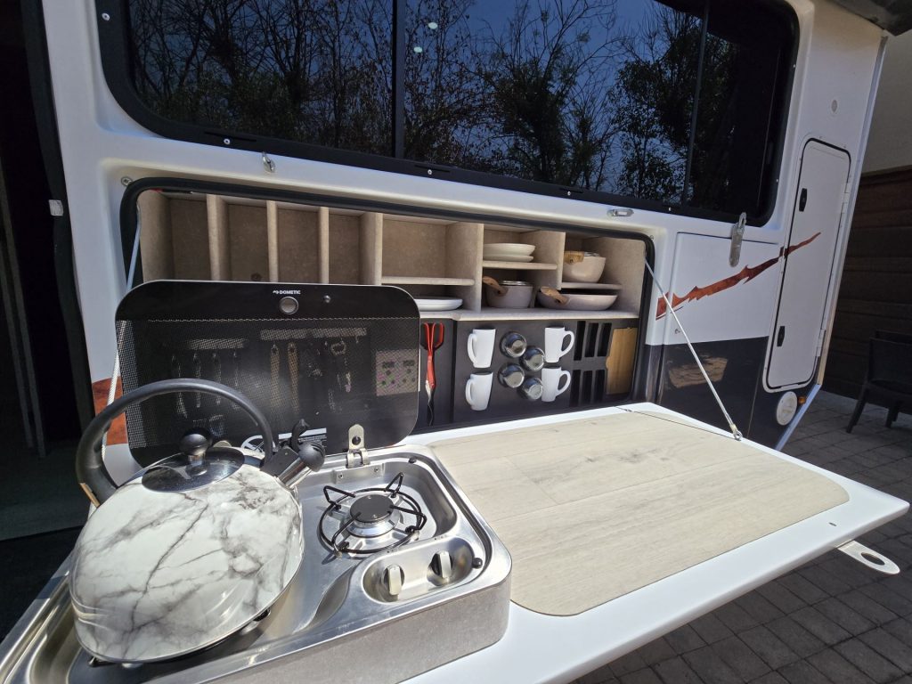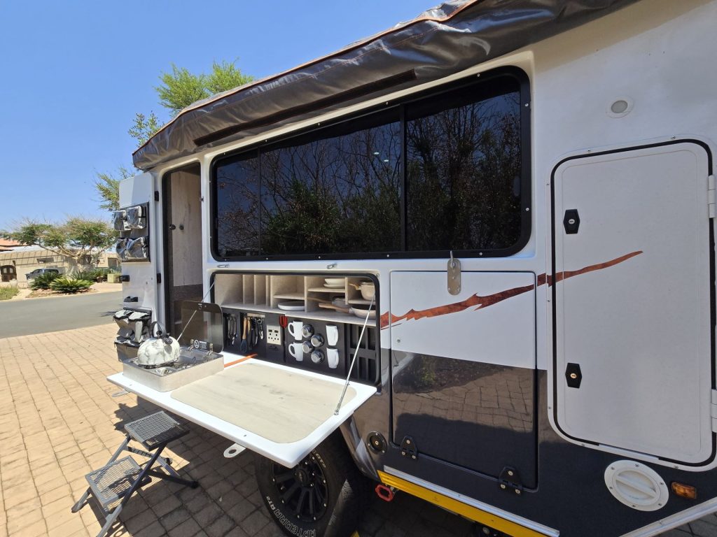The kitchen, both interior and exterior, is equipped with a fold-up roof, a fold-down work surface, a 2-burner gas stove, and various kitchenware essentials. Storage options abound with a 2100L closet, wardrobe, and groceries space, along with compartments for geyser, tools, gas, and more.